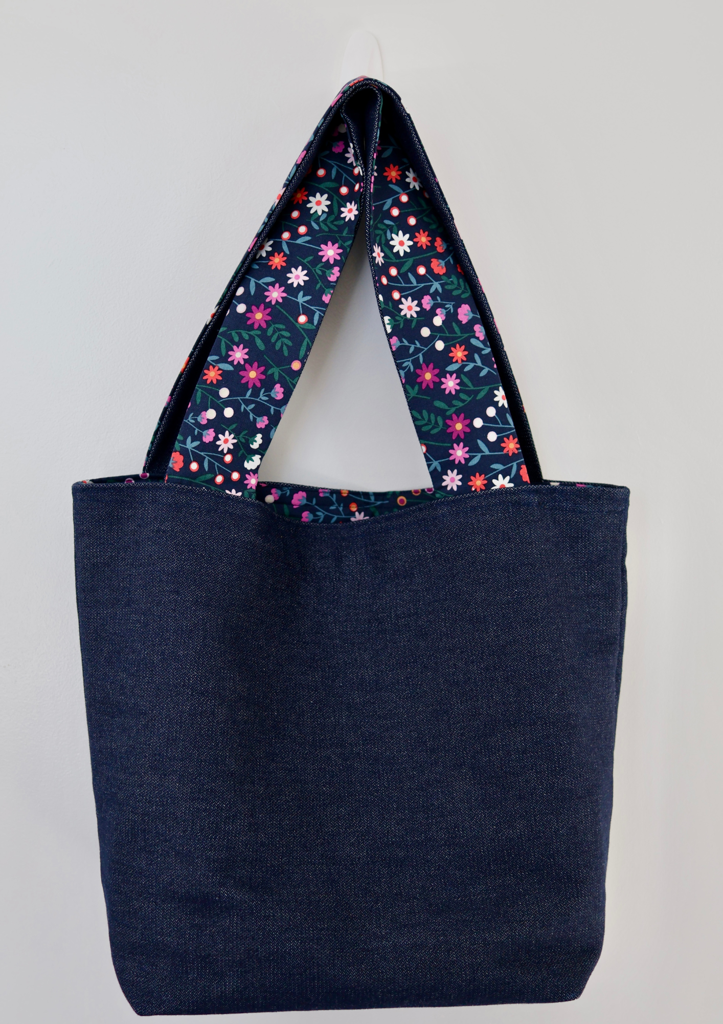 This handmade denim tote bag features sturdy dark denim paired with vibrant floral fabric handles for a unique and practical everyday carry. Designed for daily use, shopping, or casual outings, it offers a minimalist look with a colorful handmade touch. Lightweight, reusable, and thoughtfully crafted, this tote is perfect for those who love functional handmade accessories.
